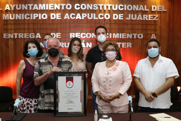 Acapulco, Gro., 30 de abril de 2021.- En reconocimiento a su labor empresarial y turística para posicionar a Acapulco como uno de los íconos en el mundo, el Gobierno Municipal que encabeza la presidenta Adela Román Ocampo galardonó a Tony Rullán Dichter, también llamado el “señor de la noche”.