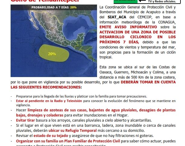 Acapulco Informa Gobierno de Abelina López Rodríguez sobre zona de posible desarrollo ciclónico en el Golfo de Tehuantepec mayo 20, 2025