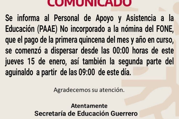 Guerrero Inicia pago de la primera quincena de enero al personal de apoyo y asistencia a la educación no incorporado al FONE enero 15, 2026
