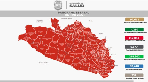 Agregó que actualmente a nivel nacional se registran 28,445 casos activos, y el Estado de Guerrero se ubica en el lugar 28 con 231, que se ubican principalmente en los municipio de Chilpancingo, con 85; Acapulco, 73; Iguala, 13; Ometepec, 11; Taxco, 8; Zihuatanejo, 7; Chilapa, 6; Tixtla, 5; Eduardo Neri, 2, y Leonardo Bravo, 2.