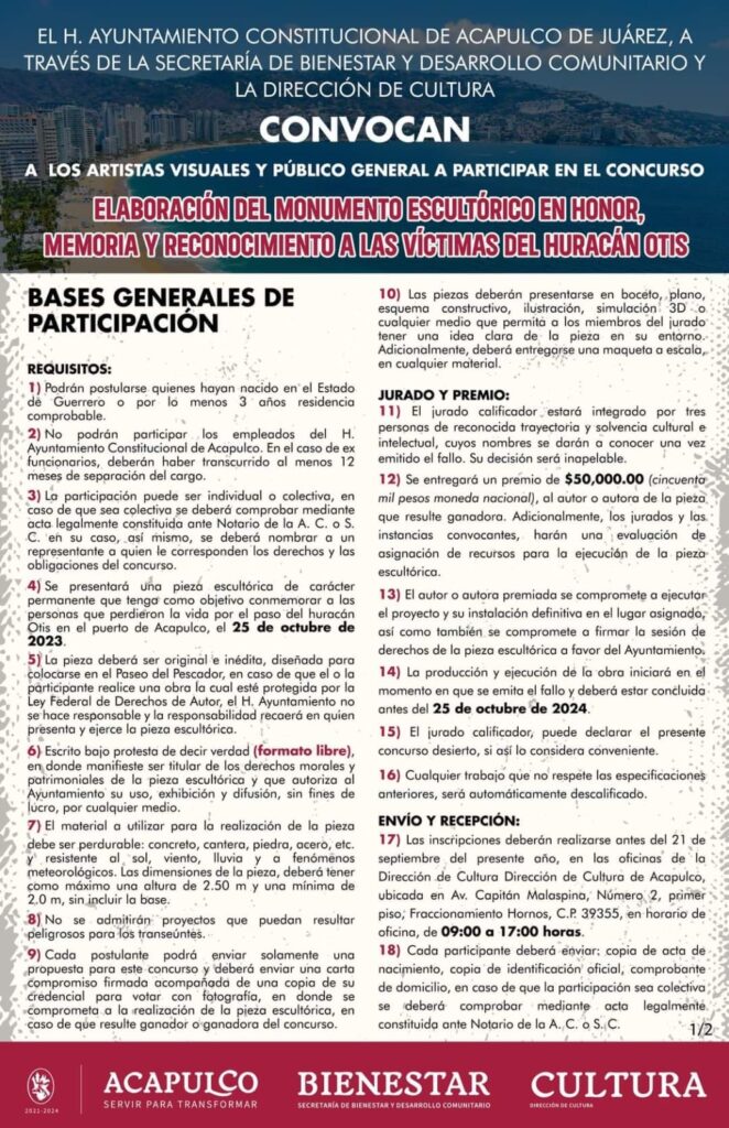 Acapulco, Gro., 05 de septiembre de 2024- La administración que preside Abelina López Rodríguez a través de la Secretaría de Bienestar y Desarrollo Comunitario, abre la convocatoria para el concurso: Elaboración del Monumento Escultórico en Honor, Memoria y Reconocimiento a las víctimas del Huracán Otis.