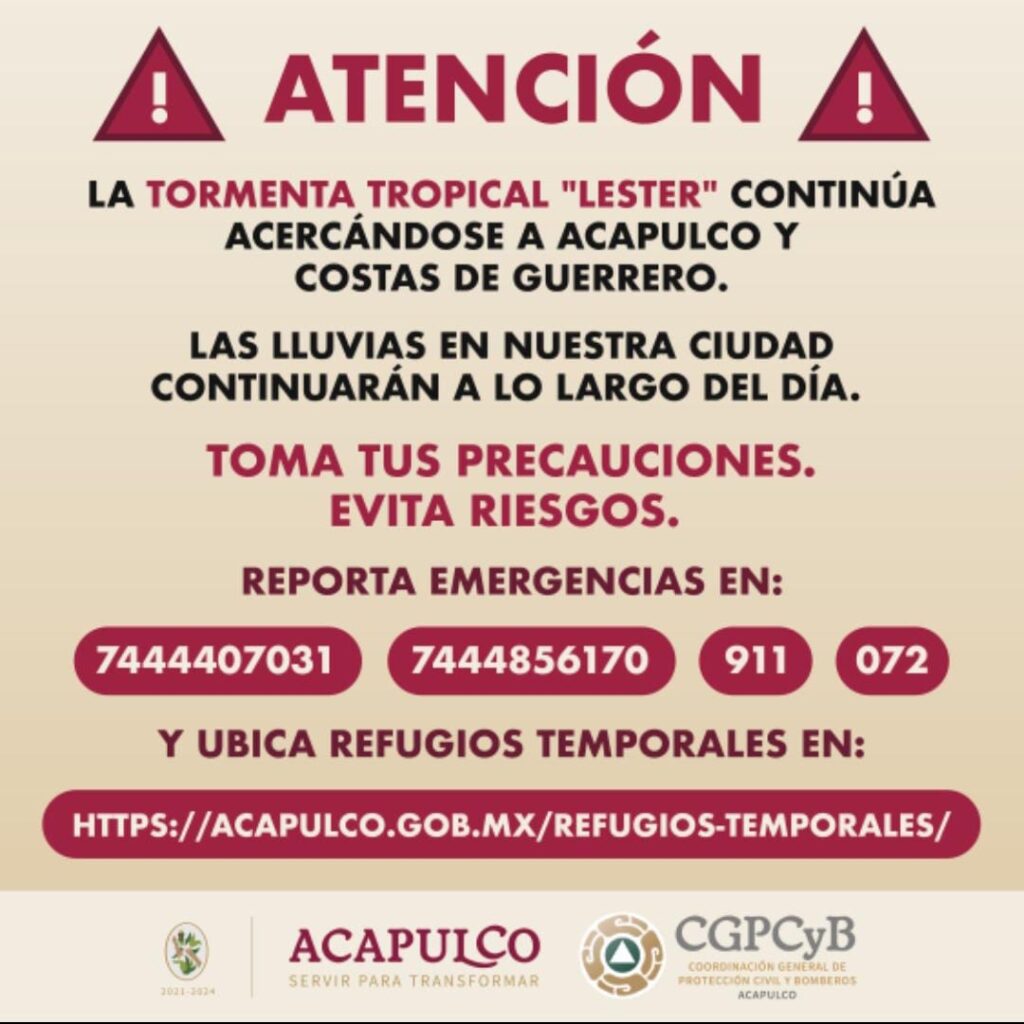 Se ponen a disposición de la ciudadanía los números 911 y 072, así como las líneas telefónicas de Protección Civil 744 440 7031 y 744 485 6170.