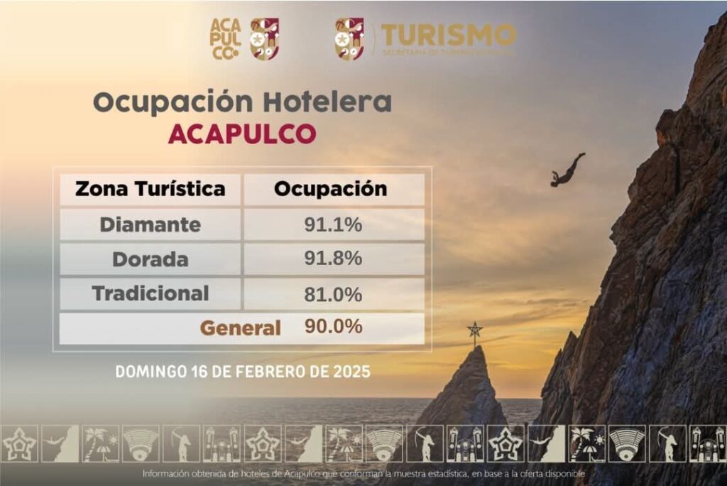 Acapulco, Gro., 16 de febrero de 2025.- Las hospederías del puerto de Acapulco registraron este domingo una ocupación hotelera promedio general del 90 por ciento, lo que representa un incremento de 11.2 puntos porcentuales en comparación con la ocupación hotelera del día sábado que fue de 78.8 por ciento, así lo indican las estadísticas del Gobierno Municipal que preside Abelina López Rodríguez a través de la Secretaría de Turismo.