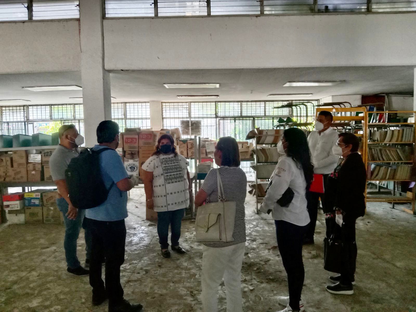 Acompañada por personal de la Dirección General de Bibliotecas, que dirige Rodrigo Borja Torres, representado por el director de Apoyo Bibliotecológico, Hugo Martínez Acosta realizaron una supervisión al inmueble para emitir un veredicto y poder realizar el descarte de material dañado.