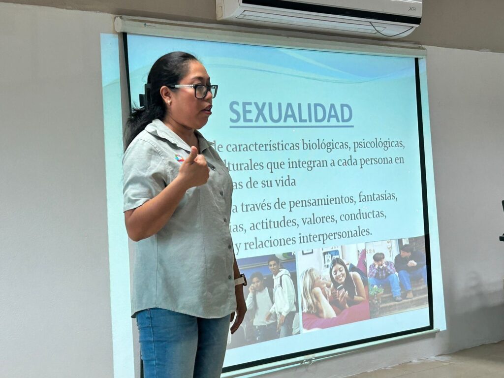 La psicóloga Italivi Estrada Martínez, responsable del Servicio Amigable para Adolescentes, perteneciente a la Jurisdicción Sanitaria 07 compartió con las y los estudiantes temas relacionados a enfermedades de transmisión sexual, los métodos de prevención, las consecuencias de los embarazos no deseados, entre otros asuntos que contribuyen al desarrollo de los adolescentes.