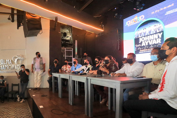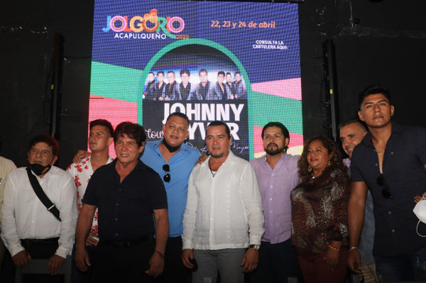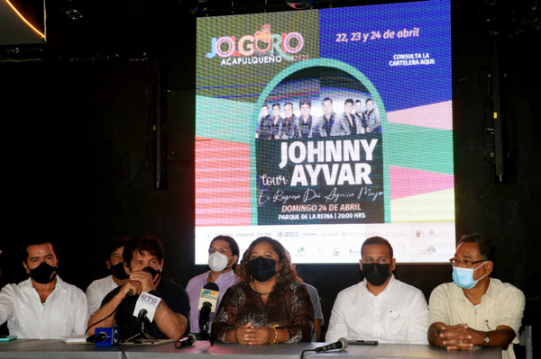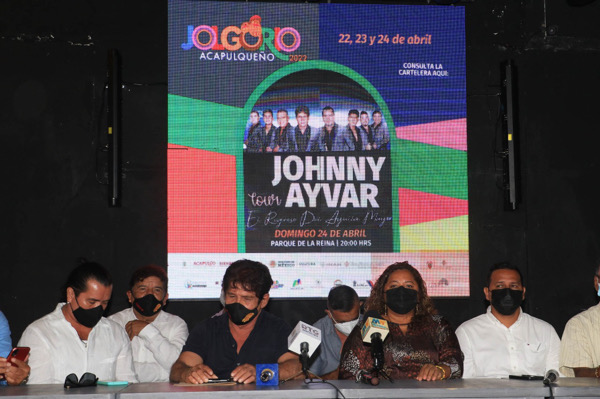 Acapulco, Gro., a 20 de abril de 2022.- El grupo Los Yonic’s, de Johnny Ayvar iniciará con su tour “El regreso del Águila Mayor”, durante la celebración del Jolgorio Acapulqueño 2022 a celebrarse del 22 al 24 de abril, el cual organiza la Secretaría de Bienestar, encabezada por la maestra Leticia Lozano Zavala, así lo anunciaron en conferencia de prensa donde respaldaron a la administración de la presidenta municipal Abelina López Rodríguez.