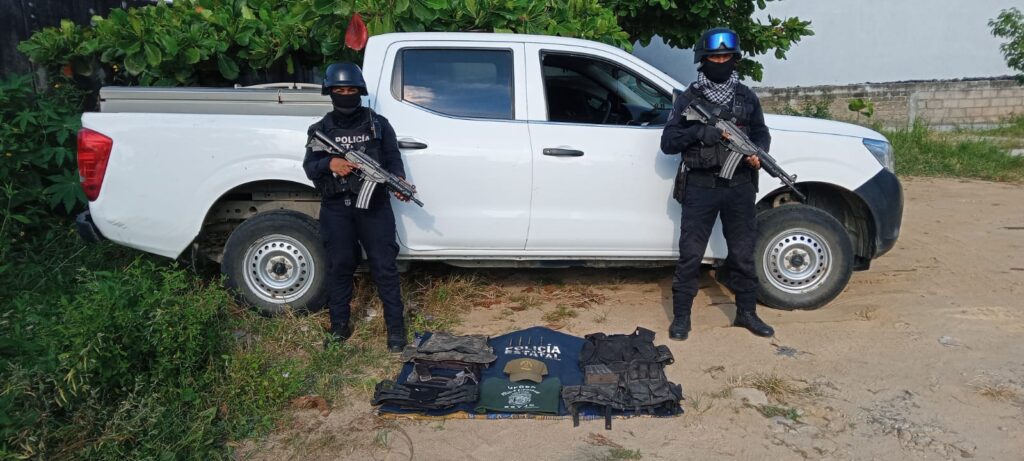 Chilpancingo, Guerrero, 13 de octubre de 2022.- En acciones de seguridad en la región de la Costa Chica, personal de la Policía Estatal aseguró chalecos tácticos, cartuchos y un vehículo con reporte de robo en Cruz Grande, cabecera municipal de Florencio Villarreal.