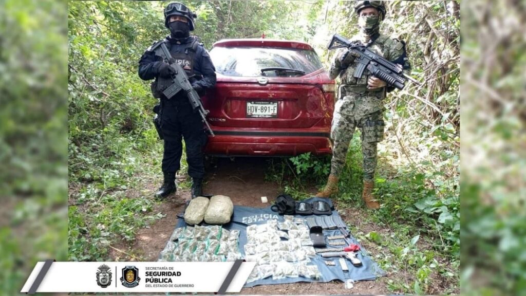 Chilpancingo, Guerrero, 13 de octubre de 2022.- En acciones coordinadas de seguridad y atención ciudadana, personal de la Policía Estatal y de la Secretaría de Marina aseguraron presunta droga, cartuchos, cargadores y un vehículo en el municipio de San Miguel Totolapan, región de la Tierra Caliente.