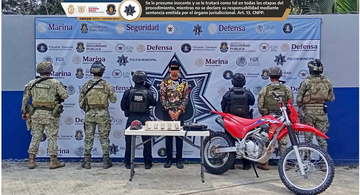 Chilpancingo, Gro., 23 de abril de 2026. La Secretaría de Seguridad Pública del Estado de Guerrero informa que, como resultado de acciones operativas interinstitucionales, elementos de la Policía Estatal, en coordinación con el Ejército Mexicano, la Secretaría de Marina, la Guardia Nacional y la Fiscalía General del Estado, realizaron la detención de una persona y el aseguramiento de presunta droga en el municipio de Zihuatanejo.