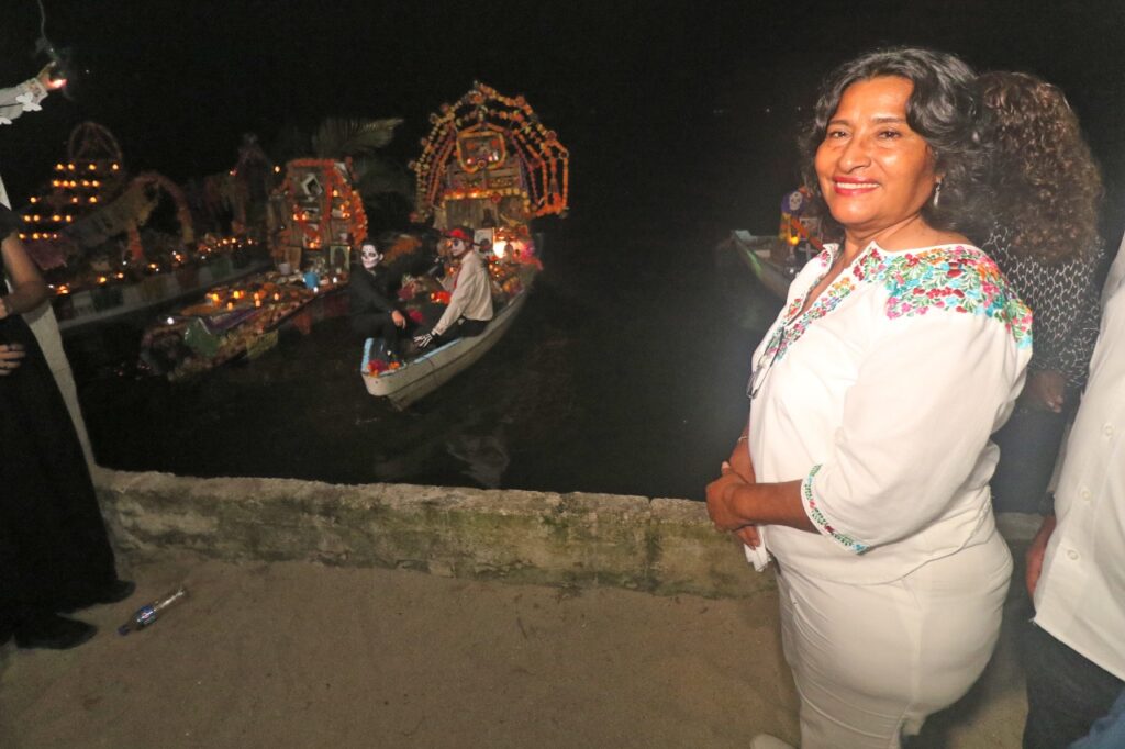 Acapulco, Gro., 31 de octubre de 2022.*- La presidenta municipal de Acapulco, Abelina López Rodríguez, asistió al festival cultural y exposición de altares sobre lanchas en la laguna de Tres Palos, con motivo del Día de Muertos.
