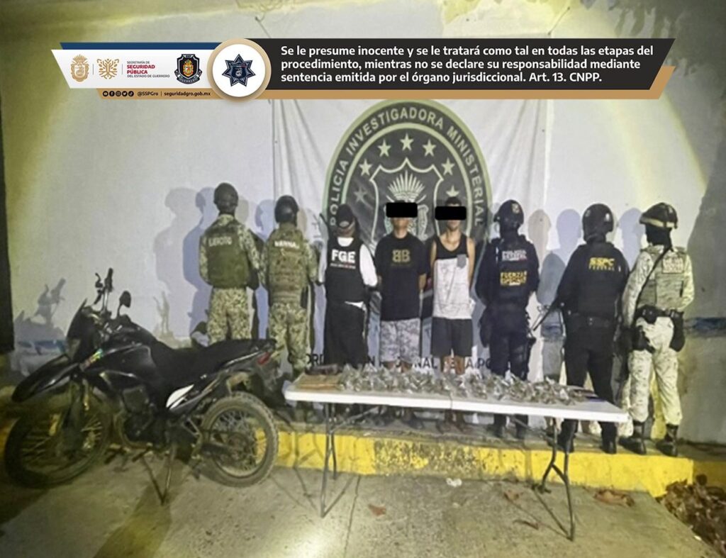 Como resultado de la acción fueron detenidas dos personas y se aseguraron bolsitas con hierba verde con características propias de la marihuana, una motocicleta presuntamente relacionada con hechos delictivos, así como dos equipos de telefonía celular.