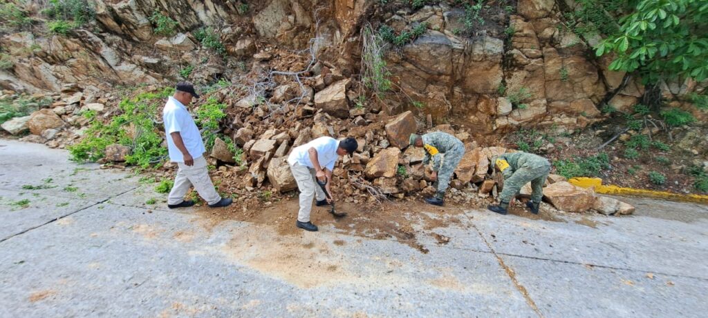 Personal de la Coordinación de Protección Civil, atendió el reporte de un derrumbe de piedras en avenida Adolfo López Mateos, en la zona Tradicional del puerto, con el apoyo de la dirección de Maquinaria Pesada y Parque Vehicular fue despejada el área.