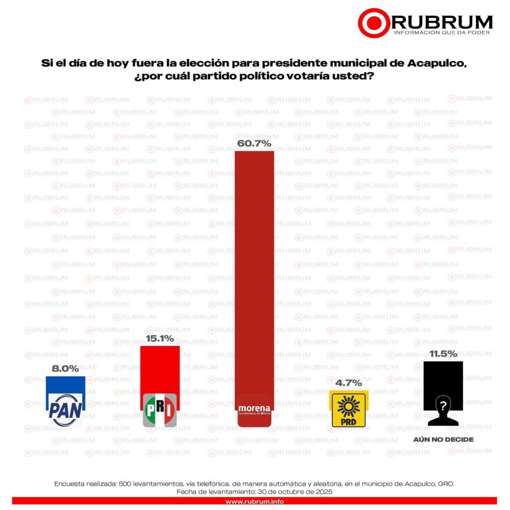 CERTEZA coloca a Morena con 21.6%, al PRI con 10.9% y al PRD en tercer lugar con 4.7%. En este estudio, el Verde marca 2.9%, MC 2.4%, el PT 1.1% y el PAN 0.8%. RUBRUM reporta 60.7% para Morena, 15.1% para el PRI, 8.0% para el PAN y 4.7% para el PRD. Massive Caller, aunque no desglosa cifras específicas, registra un 16.1% en el apartado “otros”, donde se agrupan fuerzas no individualizadas.