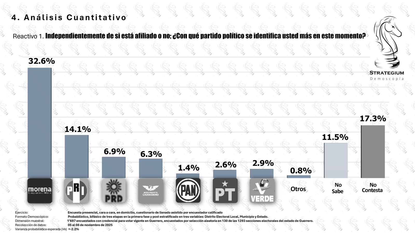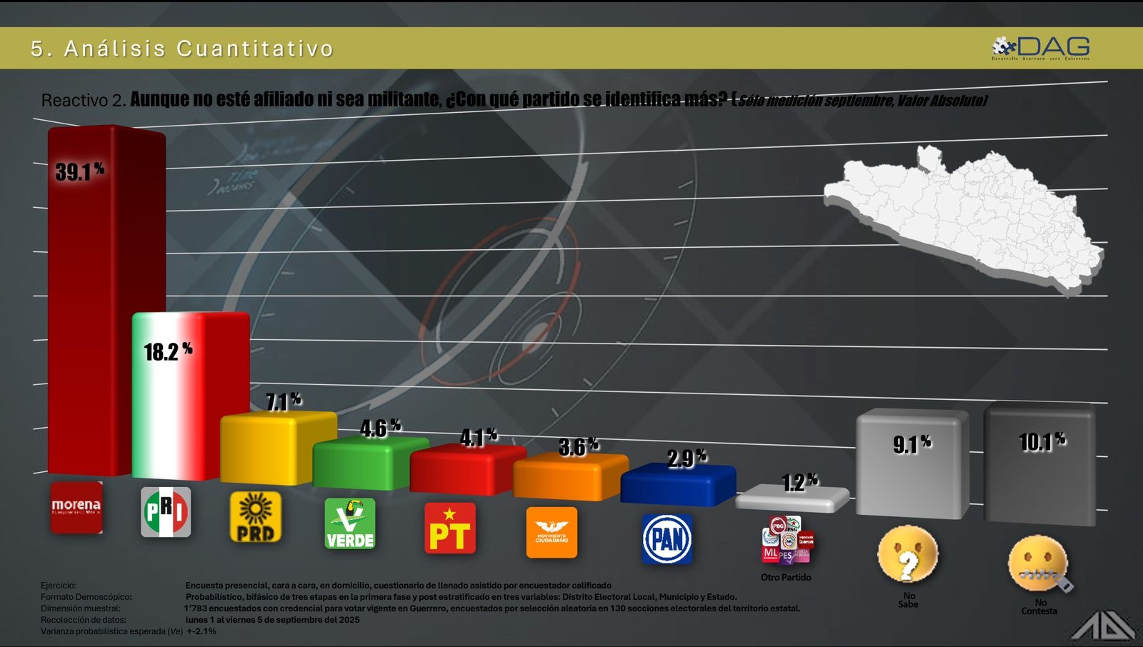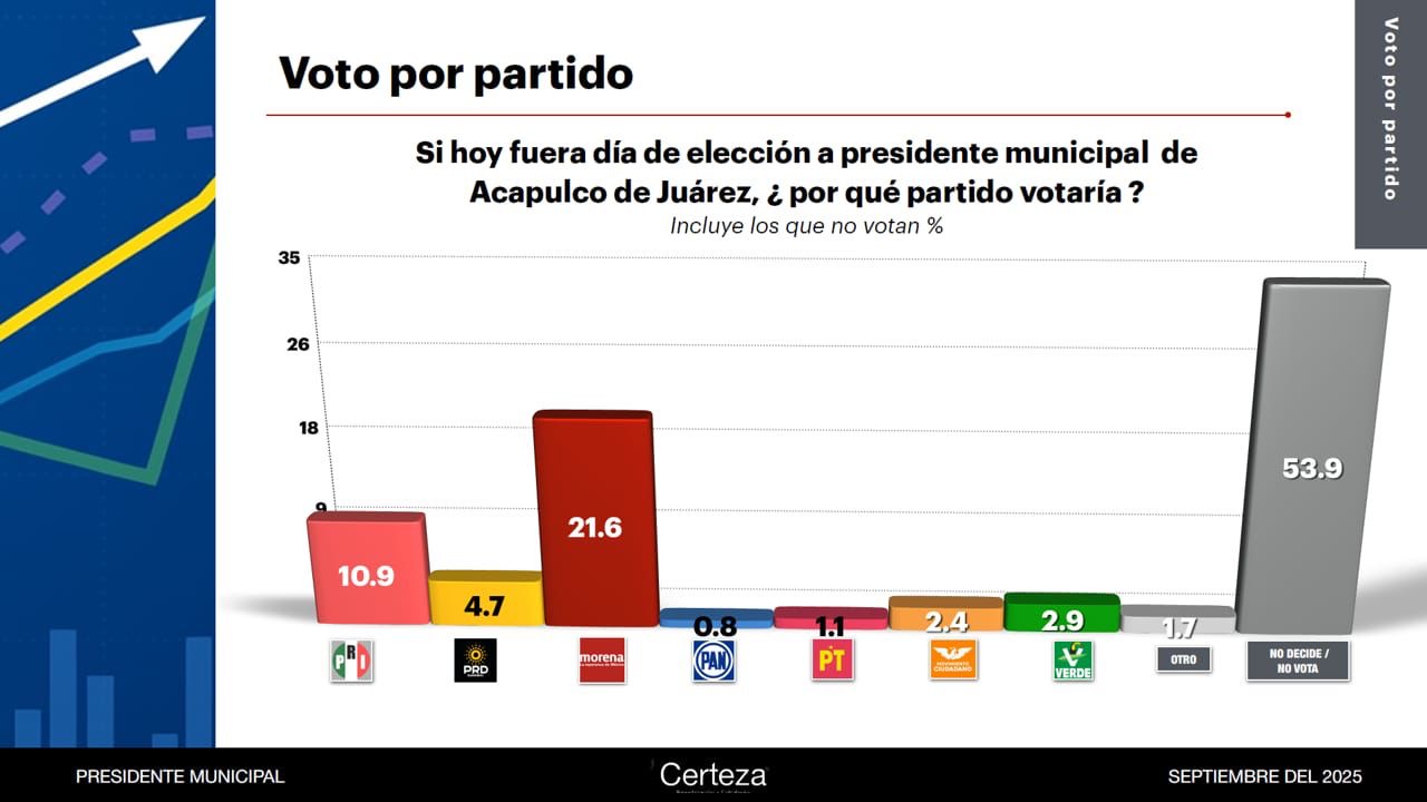 De acuerdo con Desarrollo Avanzado para Gobierno (DAG), Morena registra 39.1%, el PRI 18.2% y el PRD 7.1%, ubicándose arriba del PT con 4.1%, MC con 3.6% y el PAN con 2.9%. Strategium Demoscopía asigna 32.6% a Morena, 14.1% al PRI y 6.9% al PRD, mientras que MC obtiene 6.3%, el PT 2.6%, el Verde 2.9% y el PAN 1.4%.
