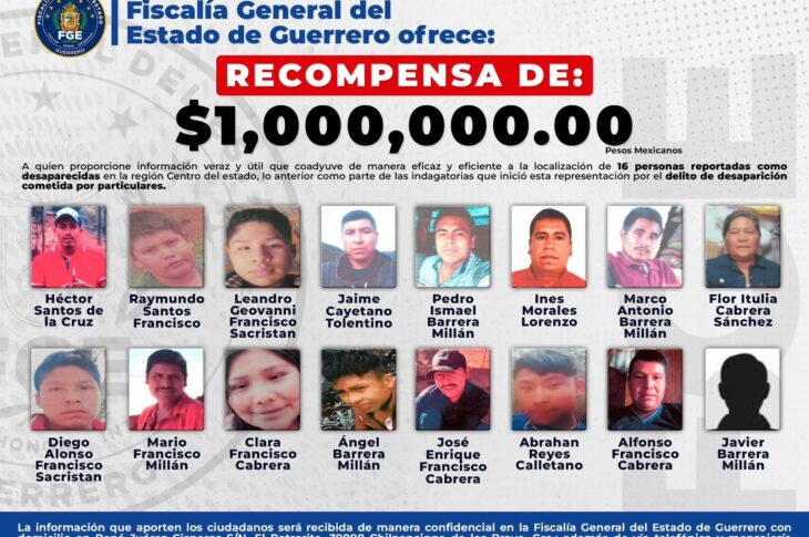 FíscaliaGuerrero OFRECE FGE RECOMPENSA DE UN MILLÓN DE PESOS POR INFORMES SOBRE 16 DESAPARECIDOS noviembre 4, 2024