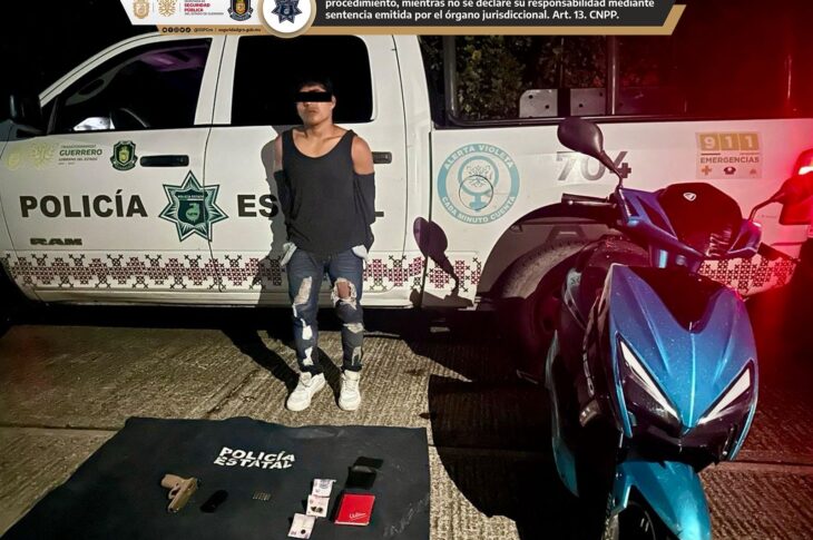 Guerrero Policía Estatal detiene a un masculino, asegura una motocicleta y un arma en Acapulco octubre 21, 2025