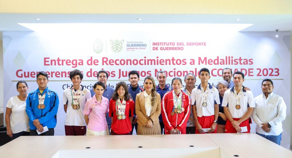 Chilpancingo, Gro., 8 de agosto de 2023. – La gobernadora Evelyn Salgado Pineda reconoció el desempeño de la delegación de deportistas que representó a Guerrero en los Juegos Nacionales CONADE 2023 al lograr de manera histórica 23 medallas para el estado en distintas disciplinas, superando el número de preseas obtenidas el año pasado.