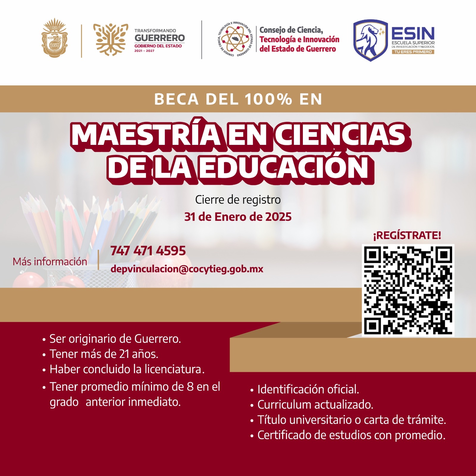 Chilpancingo, Gro., a 15 de enero del 2025.- Con la finalidad de apoya e impulsar la preparación académica de las y los damnificados de los huracanes Otis y John, como lo ha instruido la gobernadora Evelyn Salgado Pineda, Consejo de Ciencia, Tecnología e Innovación del Estado de Guerrero (COCYTIEG), en colaboración con la Escuela Superior de Investigación y Negocios, ofrece una beca del 100% para cursar en línea la Maestría en Ciencias de la Educación.