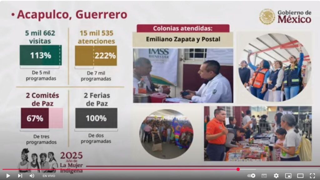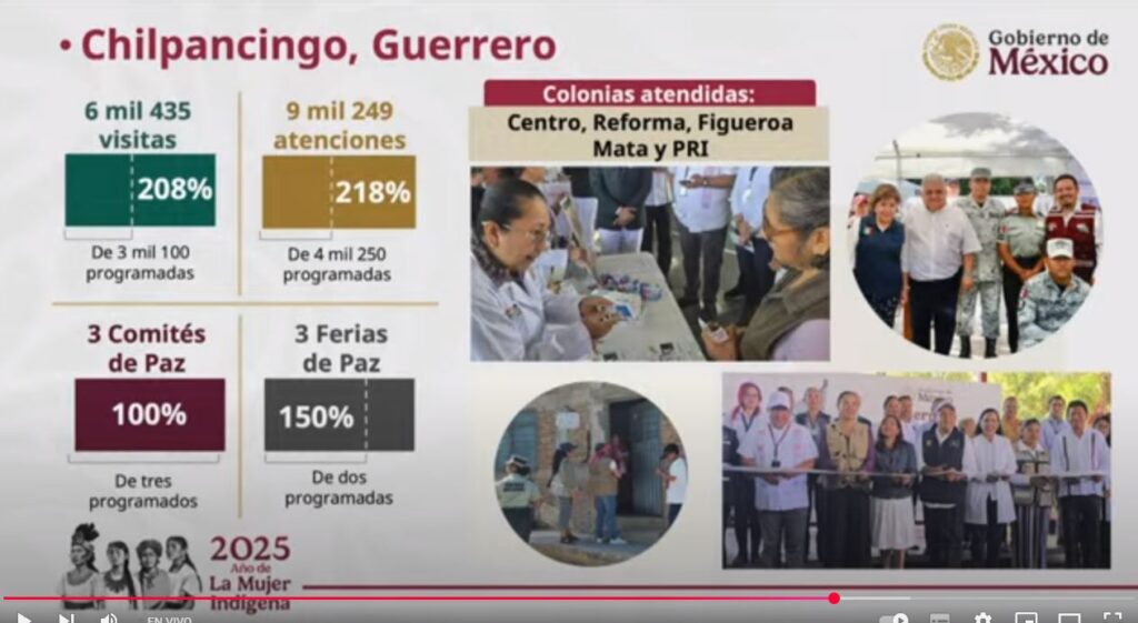 Señaló que en Chilpancingo se duplicó la meta programada realizando casi 6 mil 500 visitas y atender más de 9 mil personas en tres Ferias de Paz, mientras que en Acapulco se efectuaron 5 mil 662 visitas, así como 15 mil 535 atenciones en 2 Ferias de Paz