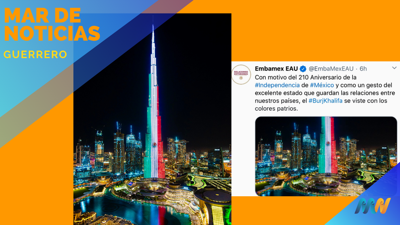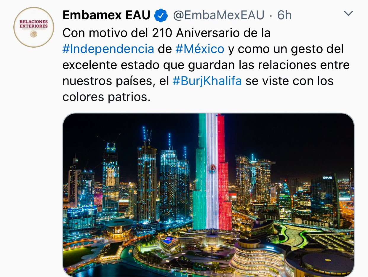 “Con motivo del 210 Aniversario de la #Independencia de #México y como un gesto del excelente estado que guardan las relaciones entre nuestros países, el #BurjKhalifa se viste con los colores patrios”, escribió la embajada en su cuenta de Twitter.