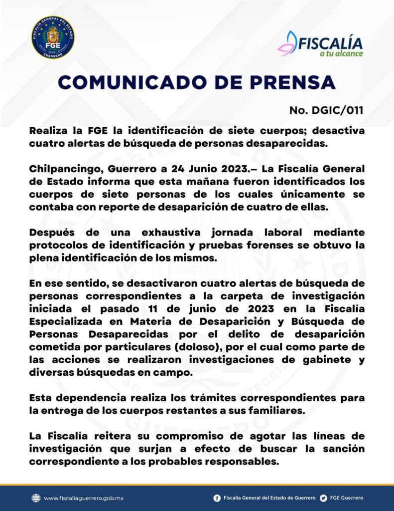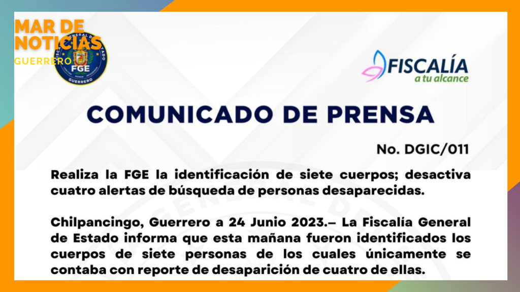 25 de junio de 2023.- La Fiscalía General del Estado de Guerrero informó que esta mañana fueron identificados los cuerpos de siete personas de los cuales únicamente se contaba con reporte de desaparición de cuatro de ellas.