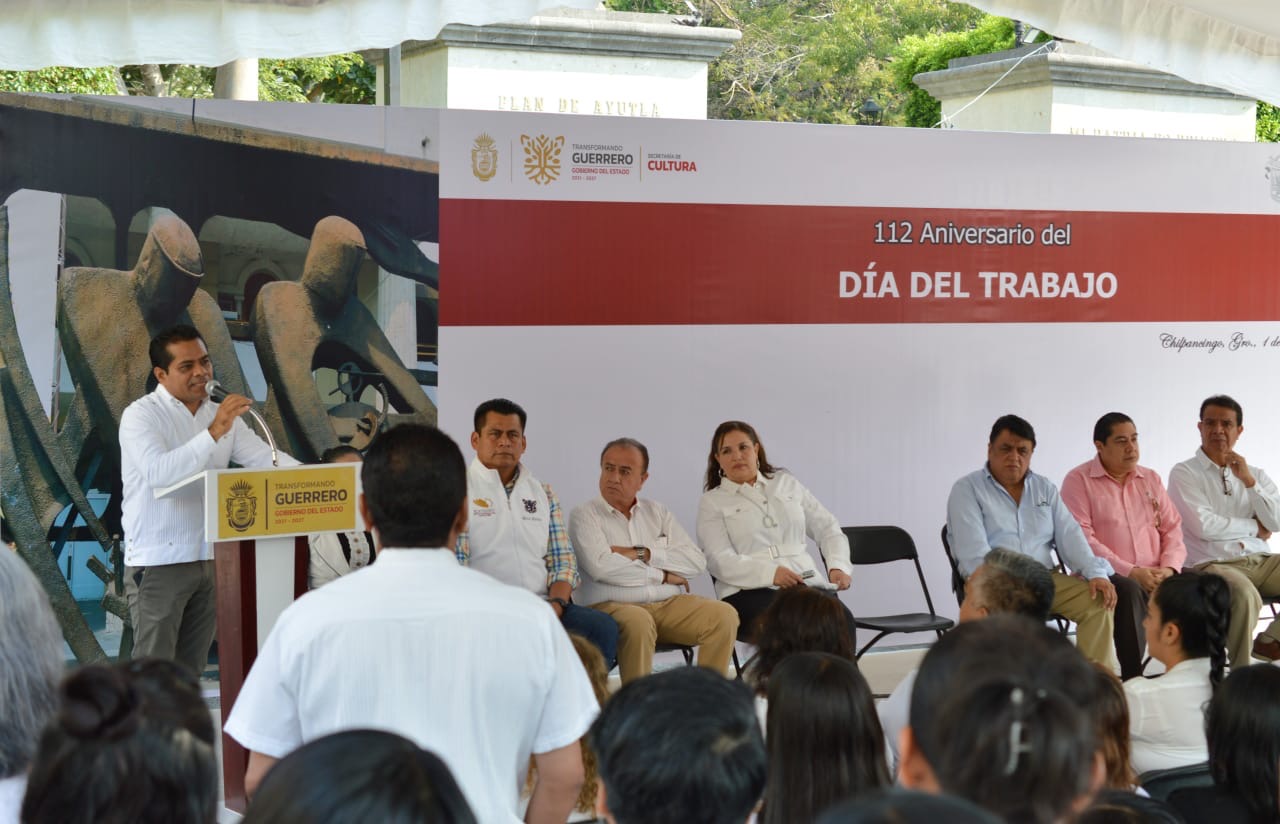 Chilpancingo, Gro., O1 de mayo de 2025.- En representación de la gobernadora del Estado, Evelyn Salgado Pineda, el titular de la Secretaría del Trabajo y Previsión Social (STyPS), Omar Estrada Bustos, presidió la ceremonia oficial de conmemoración del 1° de mayo, “Día Internacional del Trabajo”, señaló que la actual administración estatal prioriza que se garanticen los derechos humanos y laborales de las y los trabajadores, sin importar sectores o giros.