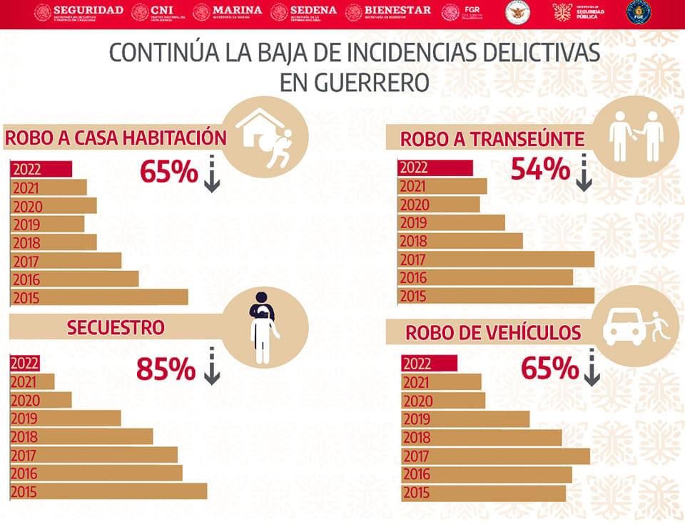 Chilpancingo, Gro. 03 de noviembre de 2022. – Derivado de la estrecha coordinación entre el Gobierno del Estado y las fuerzas del orden federal y de procuración de justicia en la entidad, el estado de Guerrero se mantiene en el octavo lugar por número de homicidios dolosos a nivel nacional con una tendencia a la baja, mientras que los delitos como secuestro, robo de vehículos, robo a casa habitación, así como robo a transeúntes han disminuido, en el comparativo anual respecto a los últimos años.