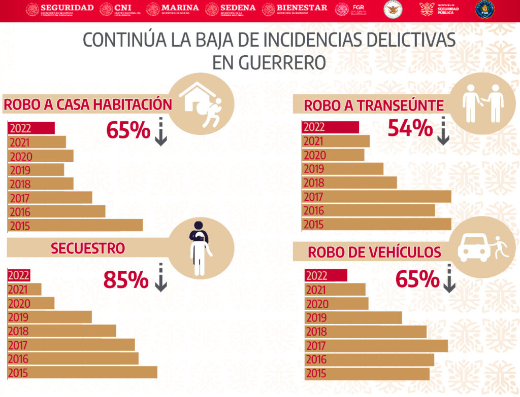 Chilpancingo, Gro. 03 de noviembre de 2022. – Derivado de la estrecha coordinación entre el Gobierno del Estado y las fuerzas del orden federal y de procuración de justicia en la entidad, el estado de Guerrero se mantiene en el octavo lugar por número de homicidios dolosos a nivel nacional con una tendencia a la baja, mientras que los delitos como secuestro, robo de vehículos, robo a casa habitación, así como robo a transeúntes han disminuido, en el comparativo anual respecto a los últimos años.