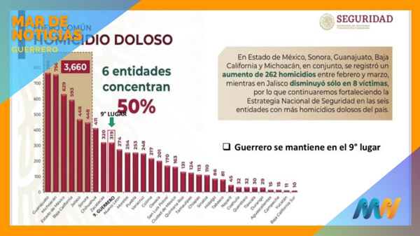 Chilpancingo, Gro., 20 de abril de 2022.- Como resultado del trabajo permanente en materia de seguridad pública y procuración de justicia Guerrero se ubica en el noveno lugar a nivel nacional en homicidios dolosos.