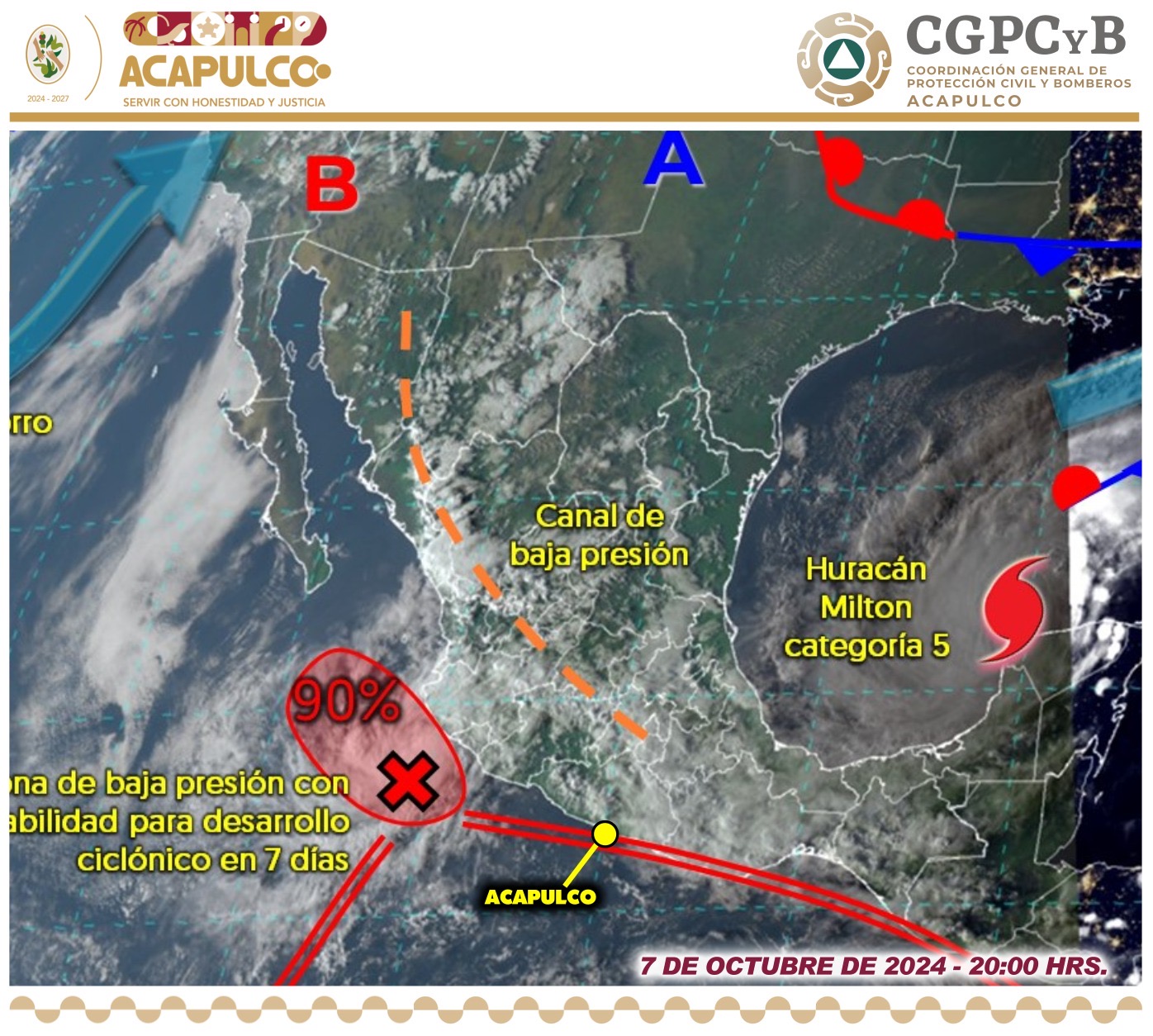 El SMN detalla que una zona de baja presión con probabilidad de desarrollo ciclónico en el océano Pacífico en interacción con la vaguada monzónica, favorecerá las condiciones de lluvia para Guerrero, por lo que se hace el llamado a la población a tomar precauciones.