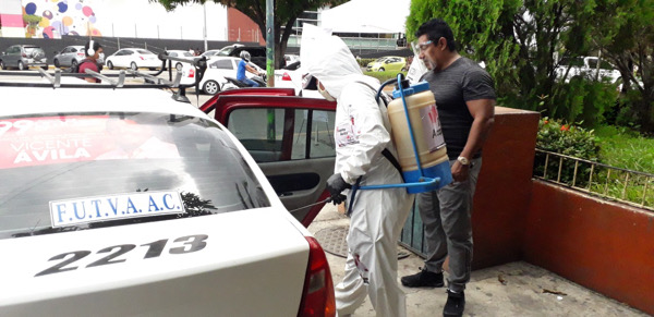 El Representante de la Sociedad Civil se presentó muy temprano al sitio de taxis ubicados muy cerca de la glorieta de la Diana cazadora, esquina casi con Costera Miguel Alemán, a quienes les ofreció desinfectar sus unidades de forma gratuita.
