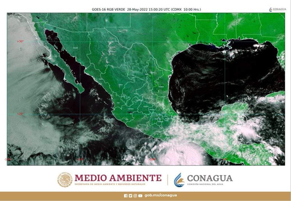 De acuerdo con el Servicio Meteorológico Nacional, a las 10:00 horas, Agatha se ubicó aproximadamente a 345 kilómetros al sur-suroeste de Puerto Ángel, Oaxaca, con vientos máximos sostenidos de 75 kilómetros por hora, rachas de 95 kilómetros por hora y desplazamiento hacia el oeste-noroeste a 7 Kilómetros por hora.