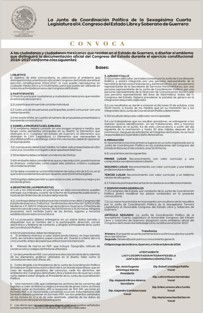 Chilpancingo, Gro., 16 de octubre de 2024.– El Congreso del Estado convoca a las ciudadanas yciudadanos guerrerenses a diseñar el emblema que distinguirá la imagen y documentación oficial del Poder Legislativo durante el ejercicio constitucional 2024-2027.