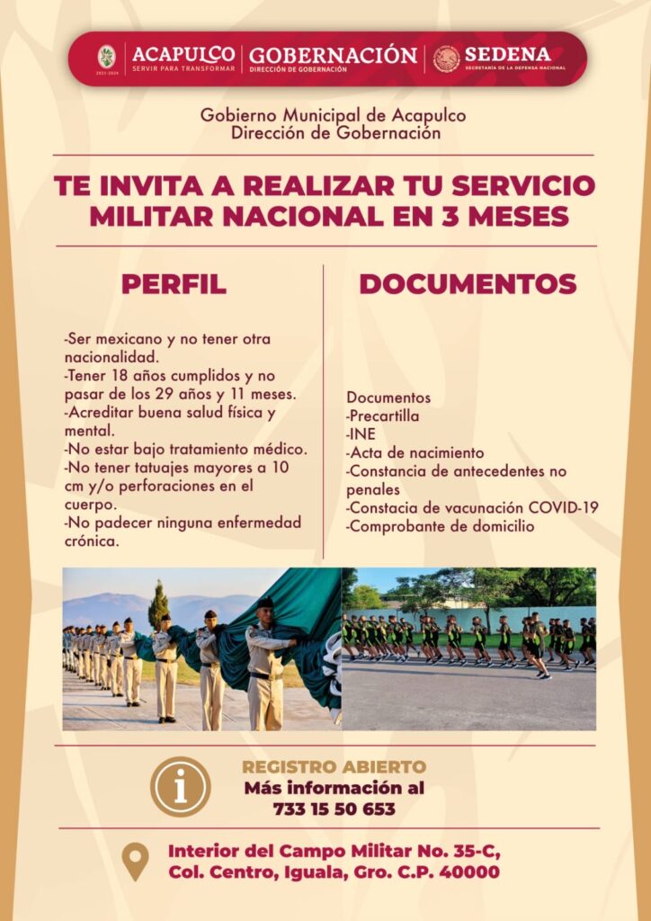 Acapulco, Gro., 21 de agosto de 2024- El Gobierno Municipal que encabeza Abelina López Rodríguez invita a jóvenes de 18 a 29 años de edad a realizar su Servicio Militar Nacional en tres meses.