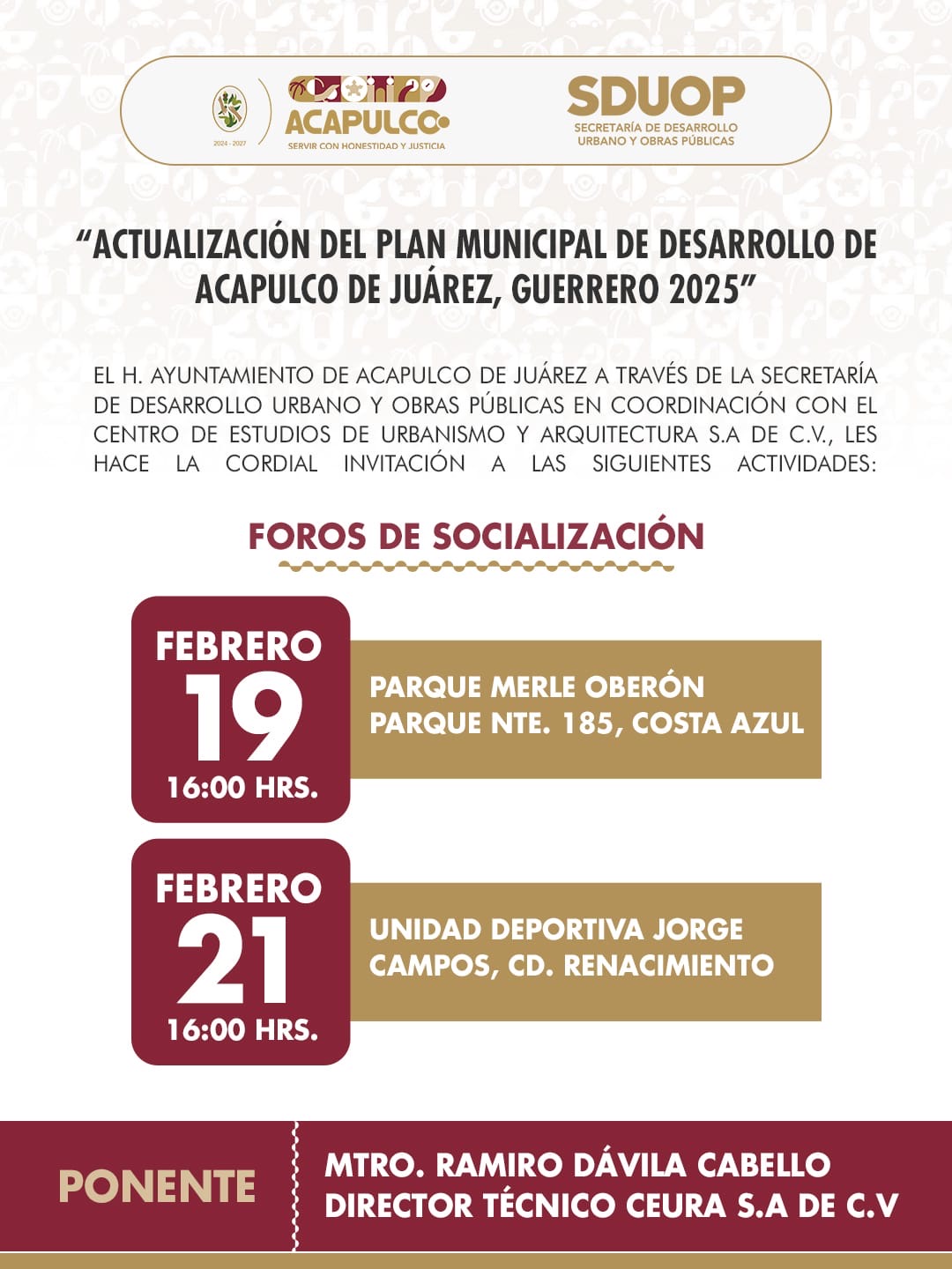 Acapulco, Gro., 18 de febrero de 2025.- El Gobierno Municipal que preside Abelina López Rodríguez convoca a la sociedad civil en general a los foros “Actualización del Plan Municipal de Desarrollo Urbano de Acapulco de Juárez, Guerrero 2025”.