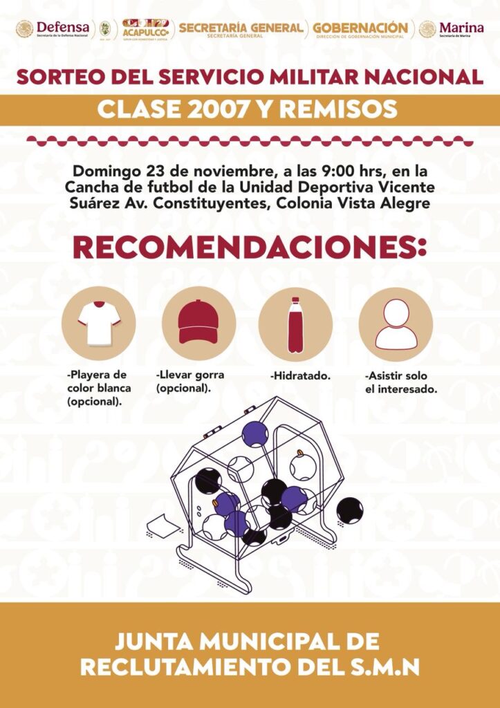 Acapulco, Gro., 19 de noviembre de 2025.- El Gobierno Municipal, encabezado por Abelina López Rodríguez, convoca a los jóvenes de la clase 2007 y remisos a participar en el sorteo del Servicio Militar Nacional (SMN), programado para este domingo 23 de noviembre.