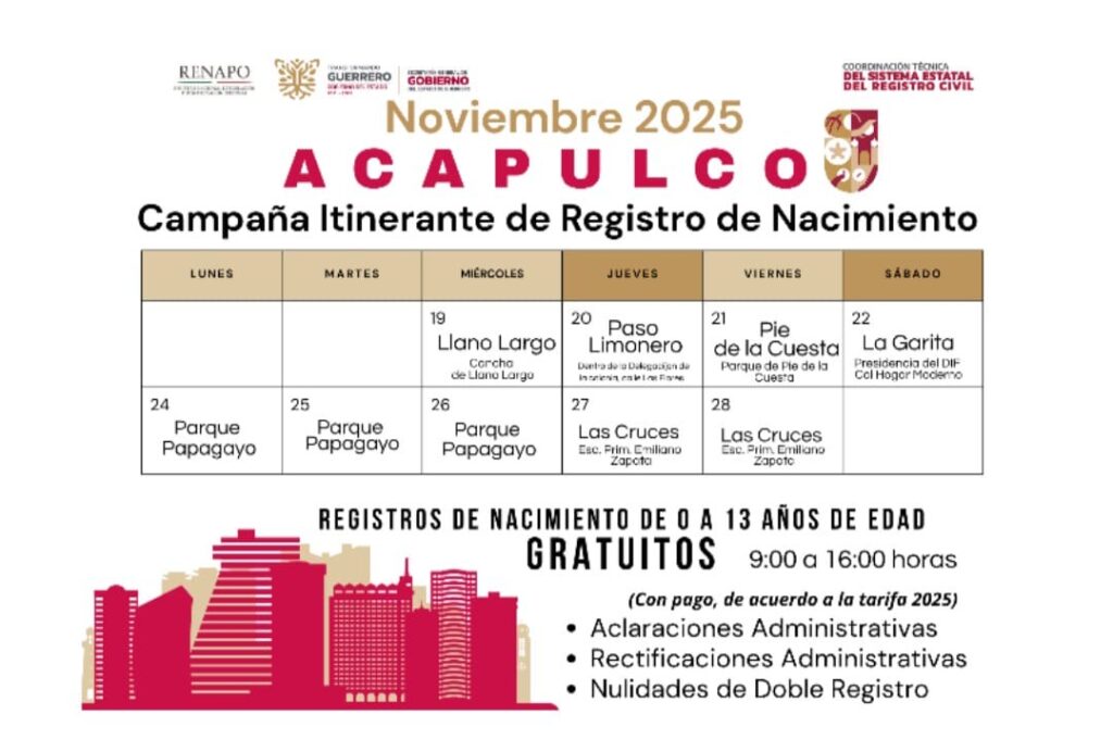 Chilpancingo, Gro., 18 de noviembre de 2025.- Para asegurar el derecho a la identidad de la niñez y adolescencia guerrerense, la Coordinación Técnica del Sistema Estatal del Registro Civil y el Registro Nacional de Población e Identidad, realizarán del 19 al 28 de noviembre la Campaña Itinerante de Registro de Nacimiento en Acapulco.