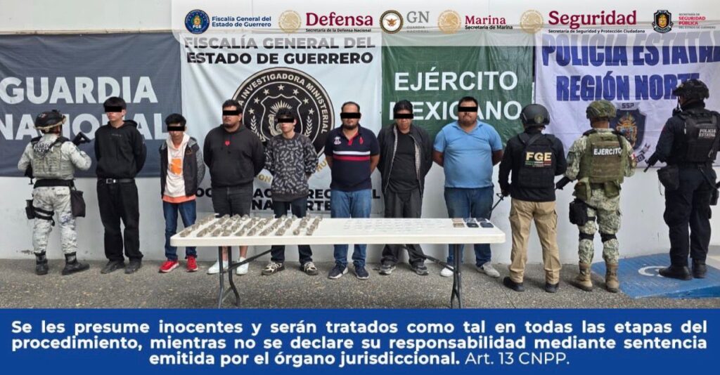 Chilpancingo, Gro., a 21 de diciembre de 2025.— La Fiscalía General del Estado de Guerrero, en coordinación con la Secretaría de la Defensa Nacional (DEFENSA), Guardia Nacional (GN), Secretaría de Seguridad y Protección Ciudadana (SSYPC) y Policía Estatal, realizó la detención en flagrancia de siete masculinos identificados como Armando “N”, Amaury “N”, Jorge “N”, Omar “N”, Tomás “N”, Jaime “N” y Ángel “N”, durante operativos implementados en el municipio de Iguala de la Independencia.