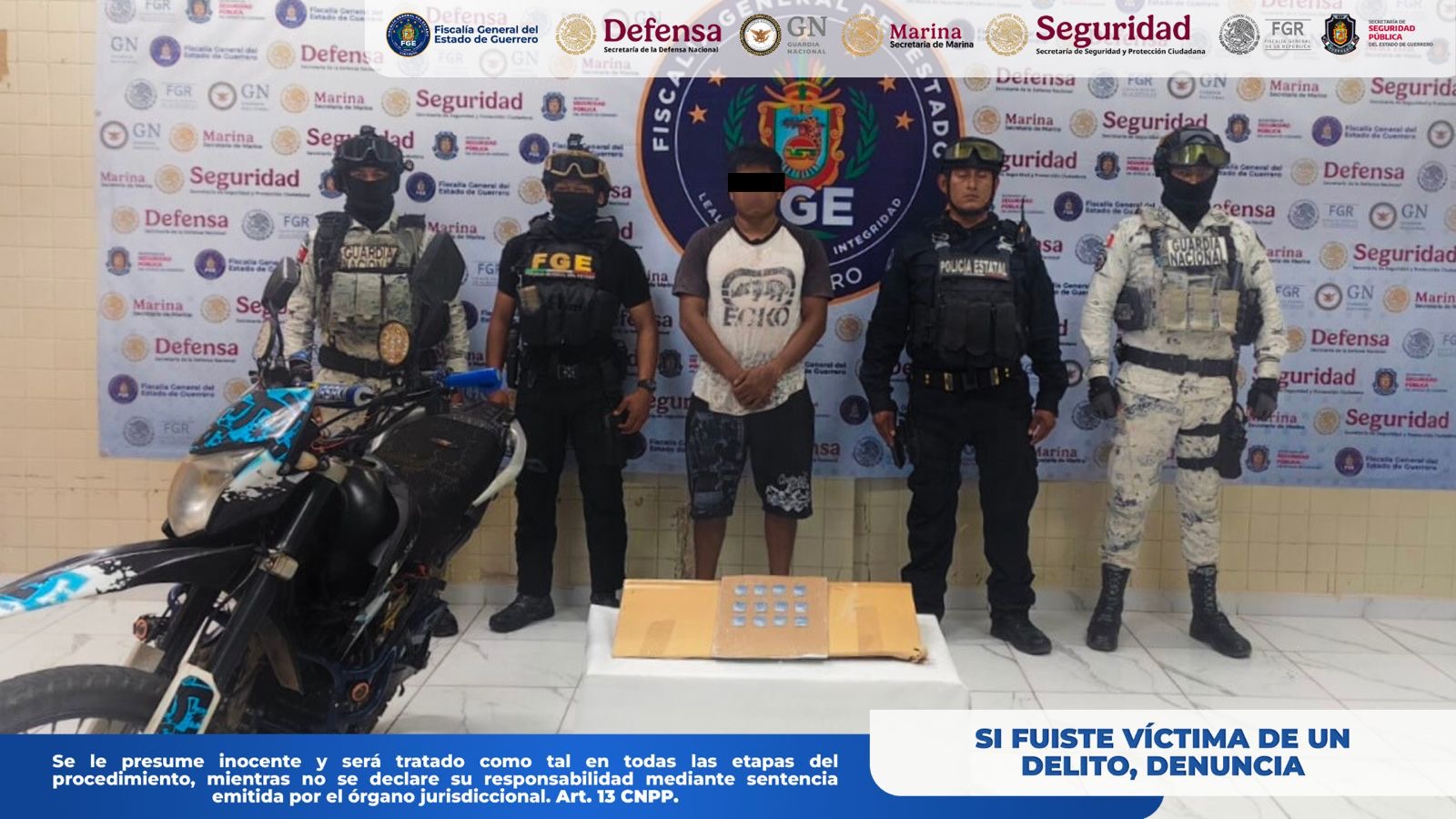 Chilpancingo, Gro., a 20 de marzo de 2026.– La Fiscalía General del Estado de Guerrero informa que, en coordinación con la Secretaría de la Defensa Nacional (DEFENSA), Guardia Nacional (GN), Secretaría de Seguridad y Protección Ciudadana (SSPC) y Policía Estatal (SSPGro), realizó la detención en flagrancia de Rodrigo “N”, en Zumpango del Rio, municipio de Eduardo Neri, Guerrero.