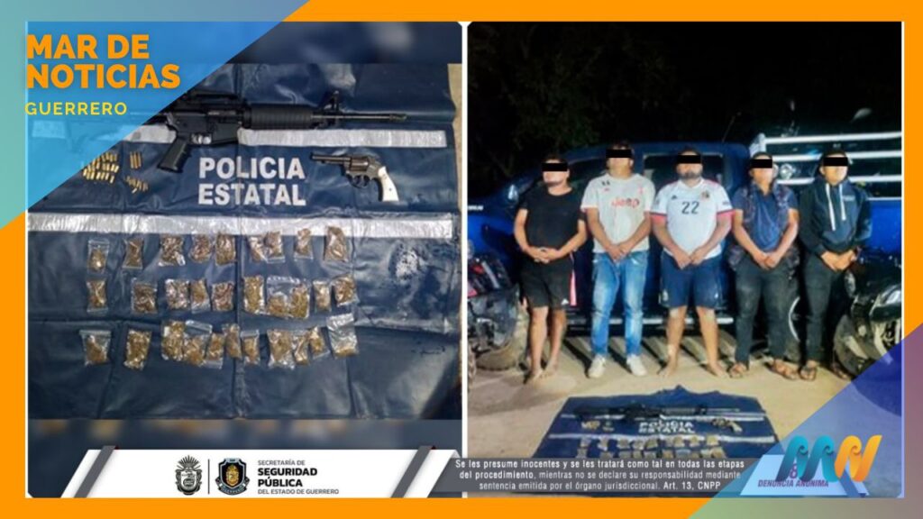 Chilpancingo, Guerrero, 23 de agosto de 2022.- Como resultado de patrullajes de seguridad, personal de la Policía Estatal detuvo a cinco individuos en posesión de presunta droga y dos armas de fuego en el municipio de Copanatoyac, en la región Montaña de la entidad.