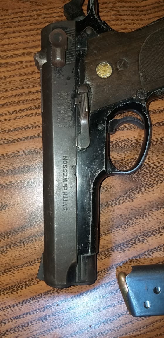 Mostró un arma de fuego con cachas de madera de la marca Smith & Wesson, con un cargador metálico abastecido con siete cartuchos útiles calibre 9mm.