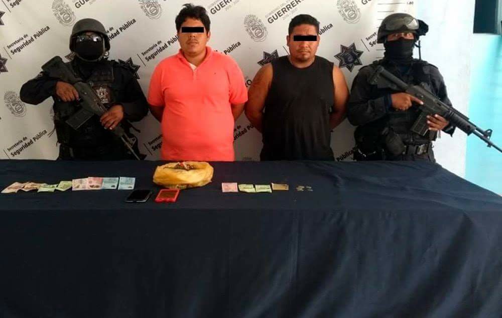 Chilpancingo, Guerrero, 20 de agosto de 2018. Grupos de reacción de la Policía Estatal que realizaban recorridos de seguridad y prevención del delito en la cabecera municipal de Arcelia, región de Tierra Caliente, aseguraron a dos masculinos en posesión de probable marihuana.