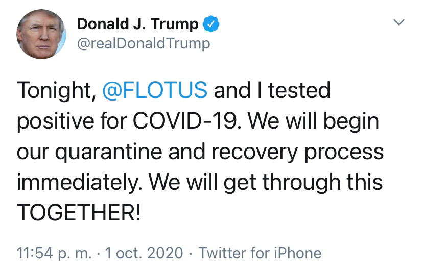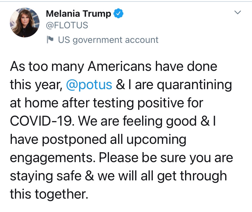 “Melania y yo dimos positivo por covid-19. Comenzaremos nuestro proceso de cuarentena y recuperación de inmediato. ¡Lo superaremos juntos!”, informó en Twitter.