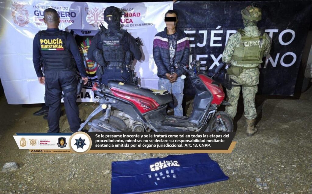 Dos detenidos, droga, una motocicleta y dos vehículos asegurados, resultado de acciones de seguridad en Teloloapan y Acapulco.