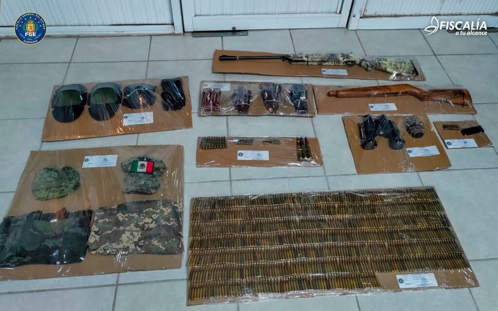 Durante la inspección del inmueble, los agentes ministeriales localizaron en su interior cartuchos útiles de diversos calibres, equipo táctico, un arma larga y un vehículo, los cuales fueron puestos a disposición del Ministerio Público, quien continuará con las investigaciones correspondientes.