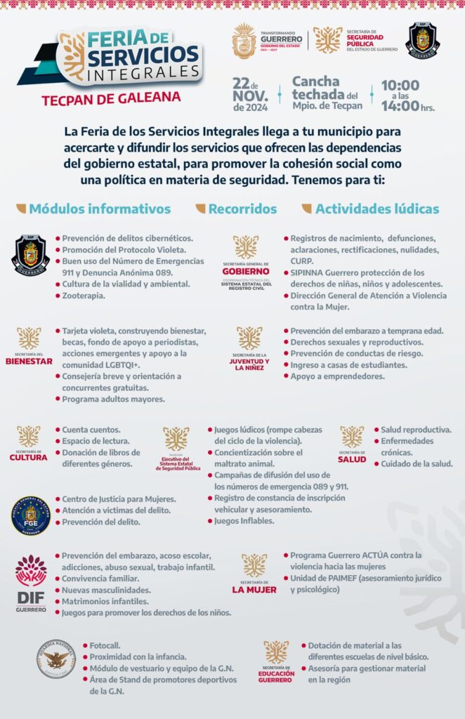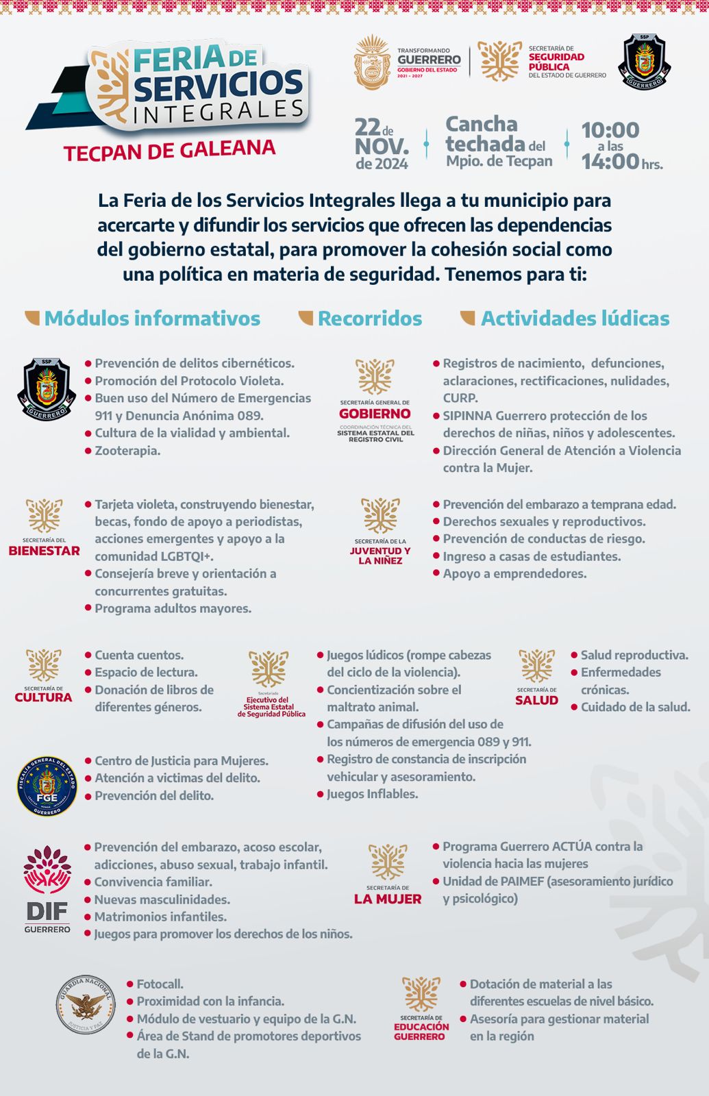Chilpancingo, Gro., 20 de noviembre de 2024.-Como parte de las acciones para trabajar de la mano con la ciudadanía y ofrecer atención directa en territorio, la Secretaría de Seguridad Pública del Estado, invita a la población de Tecpan de Galeana y alrededores, a participar en la Feria de los Servicios Integrales que el próximo viernes 22 de noviembre.