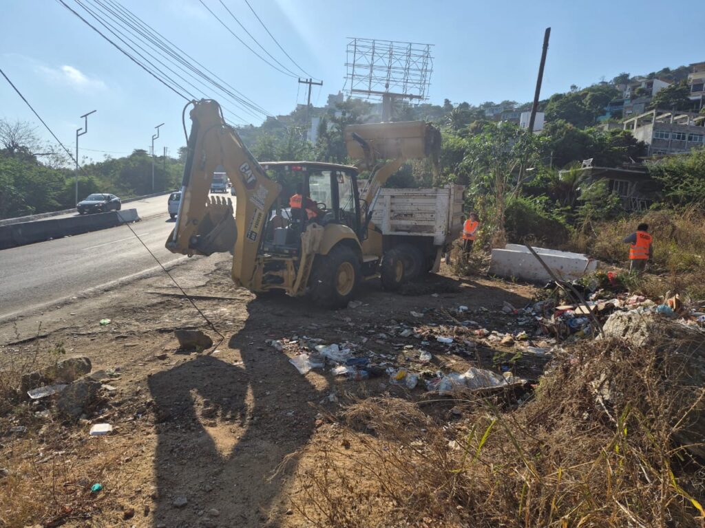 En estas tareas participa una retroexcavadora, un camión de volteo y una cuadrilla operativa, iniciando el recorrido desde la Glorieta de Puerto Marqués en dirección a la Base Naval.