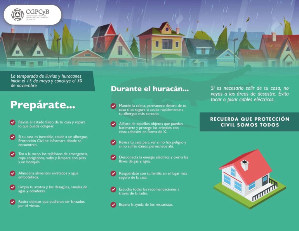 Y ante la presencia de un huracán, se recomienda mantener la calma, permanecer dentro de su vivienda si es segura o acudir rápidamente a uno de los inmuebles que han sido destinados como refugio temporal, alejarse de objetos que puedan lastimarles, y proteger los cristales con cinta adhesiva en forma de x.