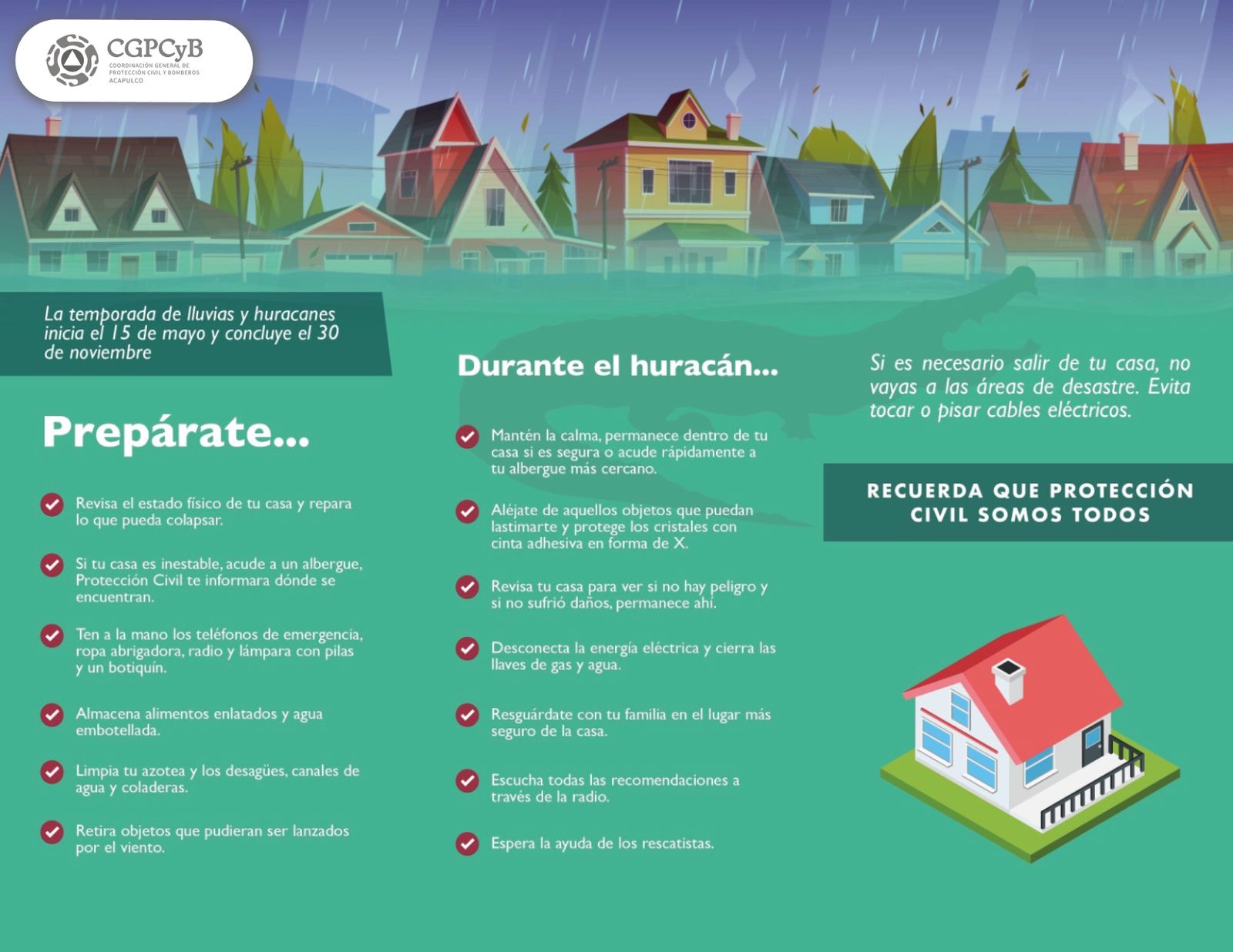 La Temporada de Lluvias y Huracanes inició el 15 de mayo de manera oficial, por ello, la Gobierno Municipal exhorta a la ciudadanía a estar atentos a los avisos que se emitan de manera oficial, y en caso de emergencia comunicarse a la línea 911, también puede reportar su incidente a los números de Protección Civil: 7444838328, 7444856170 y 7444423293.