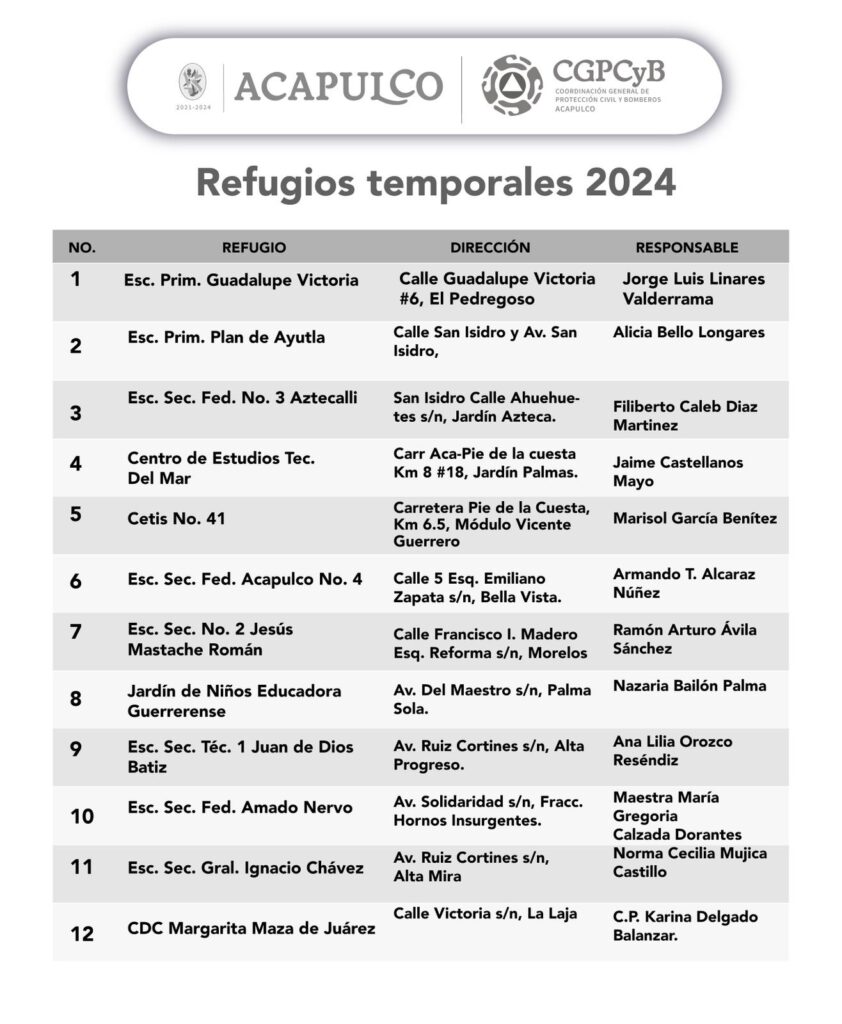 De acuerdo al listado que emitió la Coordinación General de Protección Civil, los refugios temporales se encuentran ubicados en el Pedregoso, San Isidro, Jardín Azteca, Jardín Palmas, Bella Vista, Morelos, Palma Sola, Alta Progreso, Insurgentes, Alta Mira, La Laja, Jardín de Los Amates, Costa Azul, Extensión Icacos, Cumbres de Llano Largo, Renacimiento, Mártires de Cuilapan, Emiliano Zapata, La Postal, Calle 9, La Mica, La Venta, El Coloso, Navidad, Llano Largo, Miramar, Plan de Los Amates y Luis Donaldo Colosio.